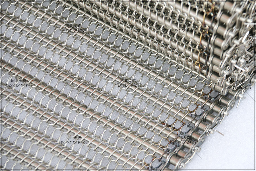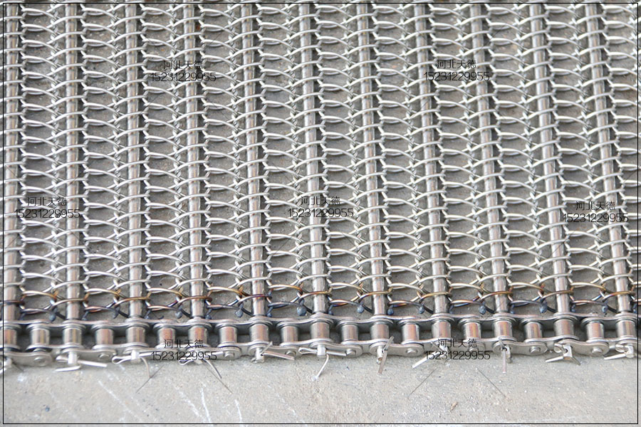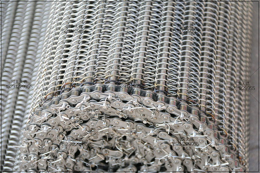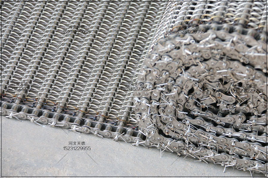 大滾珠輸送鏈輸送平穩(wěn),拉力大不跑偏,下面圖片展示的鏈條輸送帶總寬度是1米,長度為30米,絲徑采用1.5毫米的鋼絲壓彎編織的,編織孔大小為8*15毫米的。