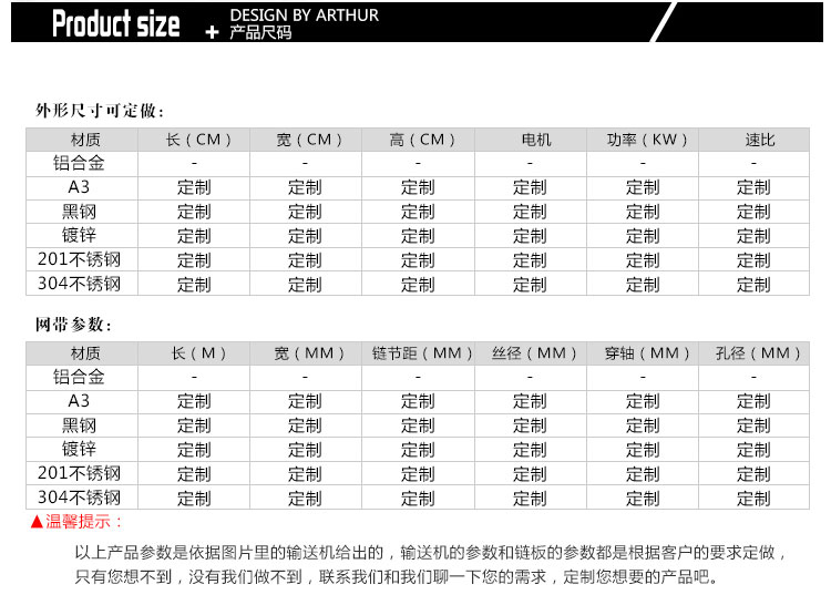 可根據(jù)客戶需求進(jìn)行設(shè)計(jì)私人訂制,如果您需要更詳細(xì)的網(wǎng)帶輸送機(jī)/食品網(wǎng)帶輸送機(jī)/網(wǎng)帶輸送線/網(wǎng)帶流水線產(chǎn)品信息,解決方案和報(bào)價(jià),請(qǐng)聯(lián)系客服,我們會(huì)為您提供熱情的服務(wù)。